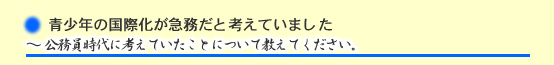 | ??????そもそも、私は昭和44年の長崎国体時の100m背泳のチャンピオンでした。その成果により当時、水泳チームとして日本のNo1であった日本大学に特待生で勧誘されました。大学時代は競泳選手としての活動のかたわら、水泳コーチの知識を数多く学び、この知識を故郷である長崎県の水泳界に寄与することを考えていました。勿論ボランティアで!!その目的を達するために、故郷である佐世保市役所に入り、就業の傍ら子供たちの育成〈主に水泳〉に心身を注いでいましたが、当時の世の中の流れとして、国際化が叫ばれるようになり、私は、将来の郷土の国際化には、青少年の国際化が急務と考え、青少年の国際交流(主に米国、中国)にも力を入れるようになりました。 |