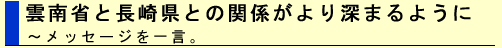 ? ? ??国際交流の基本は、まず相手の立場に立って物事を考えることから始まると思います。コツコツとしかも広い心を持って相手と付き合うことを常に考えています。皆さんもご承知だと思いますが、私の元上司(姜 雲章氏)が、この度在長崎中国総領事館の領事として着任いたしました。そのような関係ができましたことより、今後雲南省と長崎県の関係がより深まるよう期待しています。
